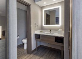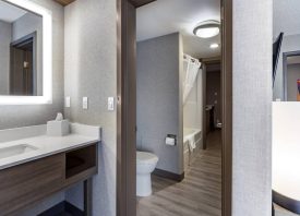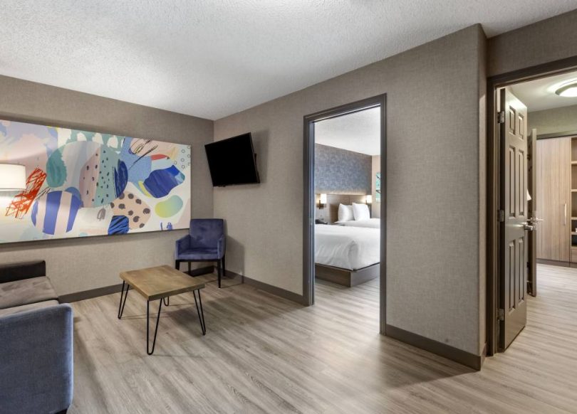 This room features a walk-through washroom with a walk-in shower, complimentary high-speed internet, a spacious work desk, and a 49″ flat screen HDTV located in both the bedroom and living area