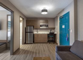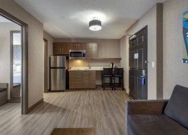 This king suite includes one comfortable king size bed, a pullout sleeper sofa-bed located in the living area, which is separated by sliding doors, a kitchenette area with a sink, overhead microwave and full-size refrigerator. This room features a walk-through washroom with a walk-in shower, complimentary high-speed internet, a spacious work desk, and a 49″ flat screen HDTV located in both the bedroom and living area