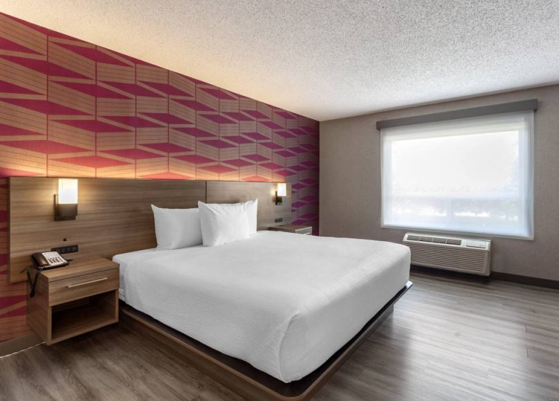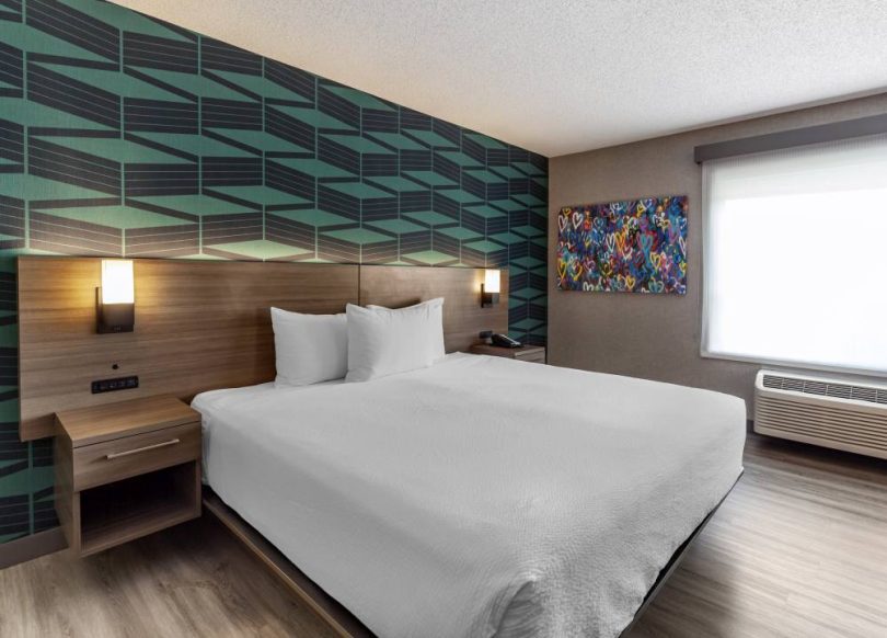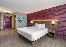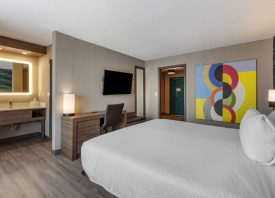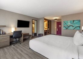 This standard king room includes one comfortable king size bed, a Keurig, microwave, and a mini refrigerator. This room features a bathtub, comlimentary high-speed internet, a spacious work desk, and a 49″ flat screen HDTV.