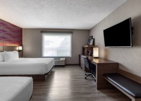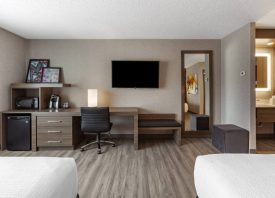 This room features a walk-in shower, complimentary high-speed internet at our spacious work desk, and a 49″ flat screen HDTV.