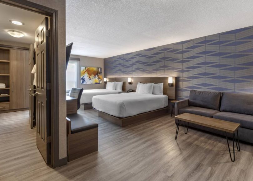 This two-queen suite includes two comfortable queen size beds, a pullout sleeper sofa-bed located in a desperate living area, which is separated by sliding doors, a kitchenette area with a sink, overhead microwave, and a full-size refrigerator.